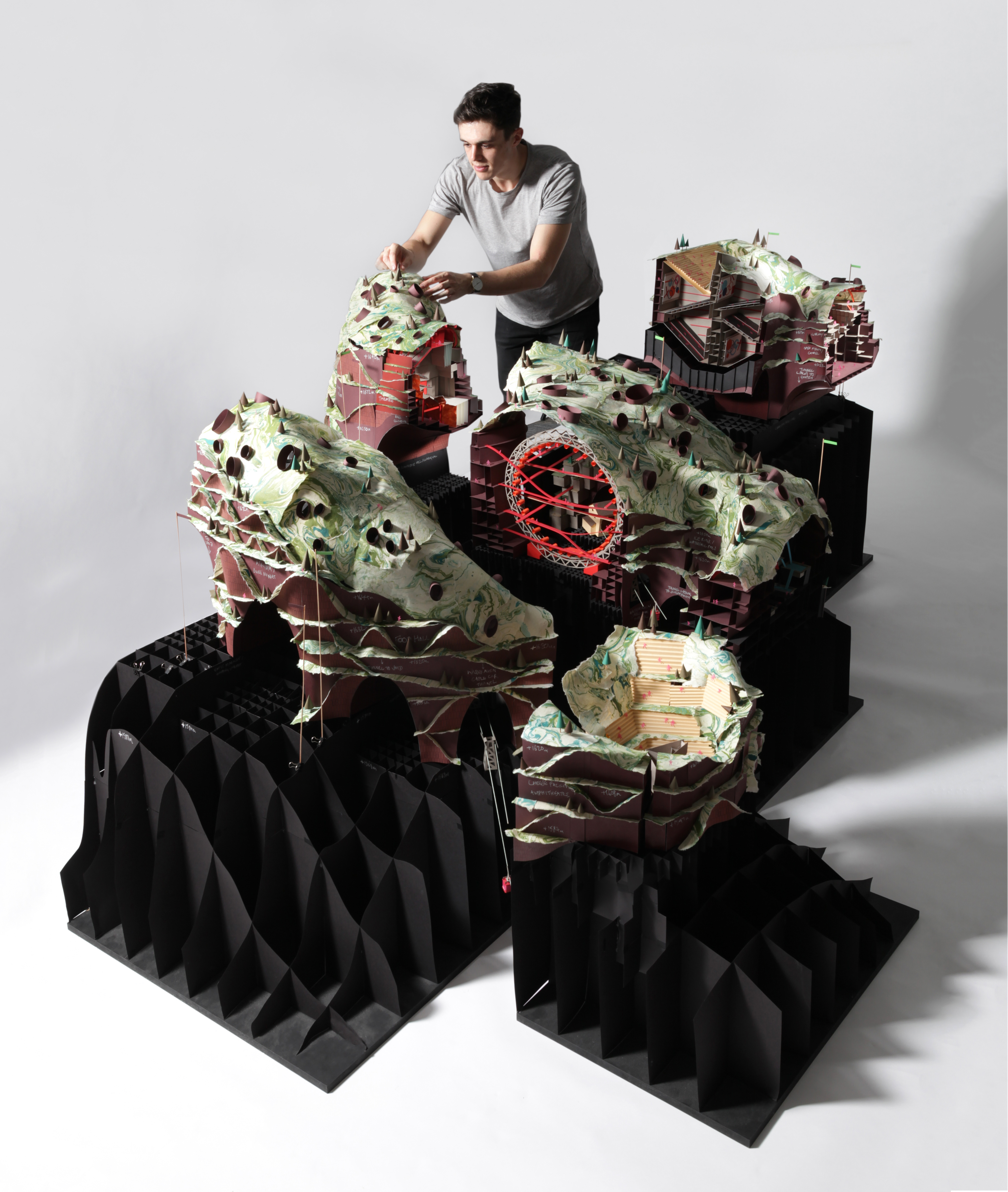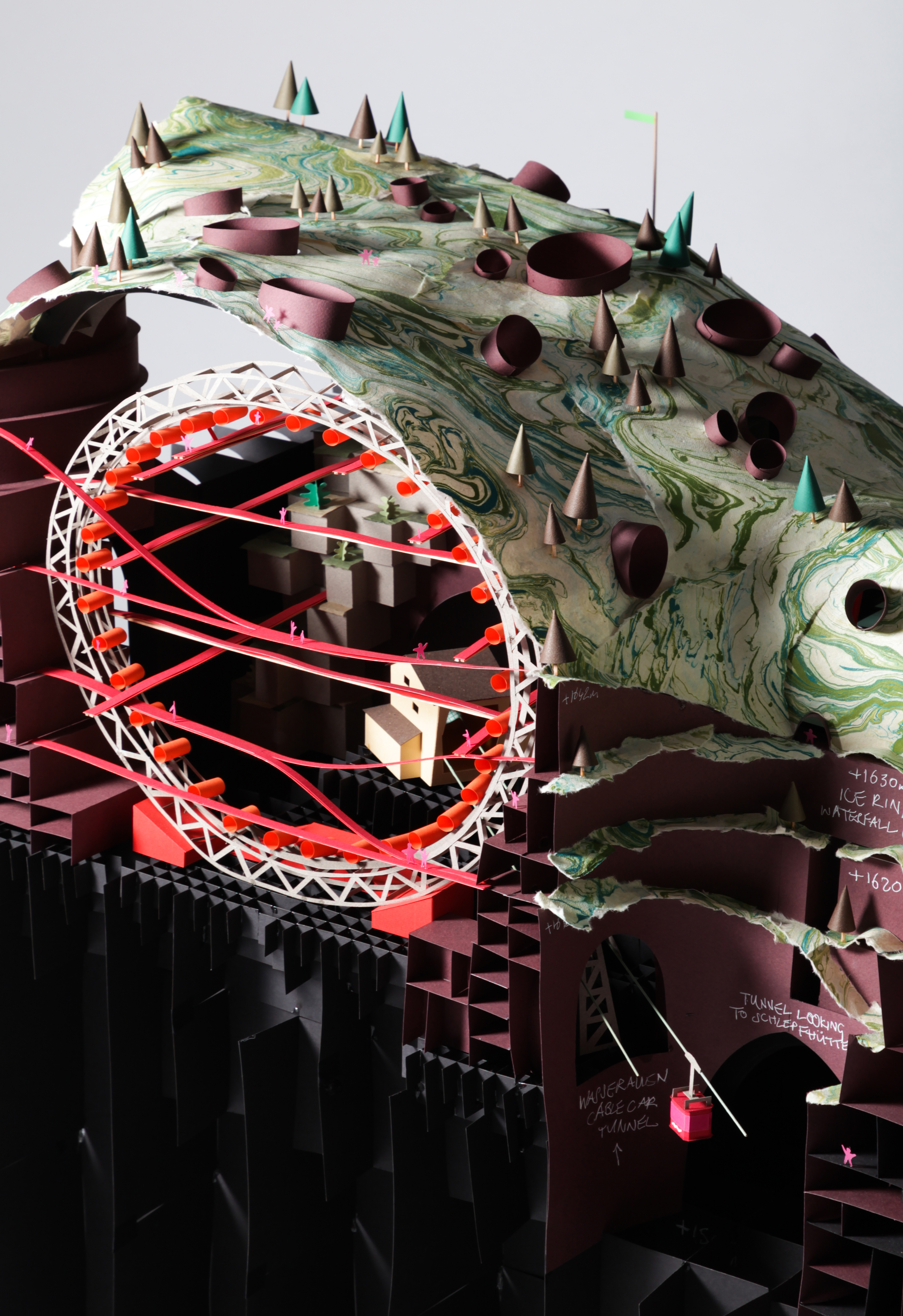 Located on the Ebenalp peak within the Santis Massif, the proposed architecture houses the Davos influx and enables collaborative discussion within a single closed world building. The scheme also references the idea of hyperreality, a subject written on by Italian academic Umberto Eco as he travelled the USA—speculating on the American fascination with duplicating culture to make it ‘better’ and more exciting. Eco references the characteristics of Disneyland, as a place that warps and distorts Americana within a setting of ‘fake nature’. In parallel, Alposanti does the same within the context of Switzerland. The project references motifs of ‘Swissness' (landscape, culture and architecture) and plays them out within the closed world, including the decision to make the entire building a mountain, in homage to the Alps that are so much a part of the Swiss identity.